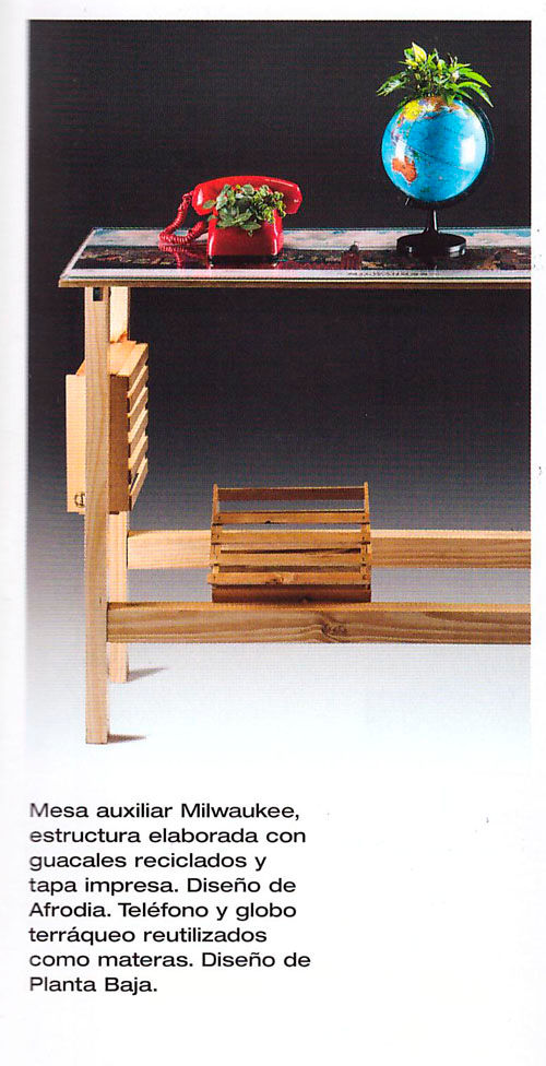 Mesa Auxiliar Milwaukee, estructura elaborada con guacales reciclados y tapa impresa. Diseño de Afródia.
